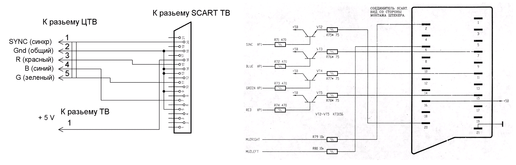 3. Подключение аналогично пункту 2, но через разъем ЦТВ. При этом сигналы R, G, B, SYNC - замешиваются в единый композитный, который подается на черно-белый монитор, и в результате получается не монохромное изображение, а полноценное черно-белое, с градациями серого. При таком подключении есть один минус - в режиме разрешения экрана 512x256, буквы стандартного знакогенератора выглядят плохо читабельными (как и в цветном режиме при таком же разрешении). Схему такого замешивания сигналов, в сети пока найти не удалось. 4. Подключение к современным телевизорам и мониторам через разъем "Тюльпан".Осуществляется через БКшный разъем ТВ, как и к монитору "колокольчик", в результате получается монохромное изображение. Также возможно подключение к "тюльпану" через разъем ЦТВ, используя замешивание сигналов в единый композит (как в пункте 3), получая в результате такие же градации серого, как в пункте 3 для "колокольчика", с теми же нюансами отображения текста при разрешении 512x256. 5. Подключение к современным телевизорам и мониторам через разъем SCART. Выводим цветное изображение, подключая БК к SCART через разъем ЦТВ по одной из схем: Лично у меня подключено по первой схеме к старому ЭЛТ-телевизору Thompson, показывает отлично. Дополнительно, как показано на второй схеме, вывел звук бипера (у БК0011М он подведен на 3-й контакт разъема ТВ) на SCART, теперь можно регулировать звук на телевизоре, делая его громче/тише. Комментарий пользователя dmluk к данной схеме: Исключено подключение к +5в ноги 16 SCARTa (Fast Switch) и освободившийся конец подключен к ноге 20 (Video).