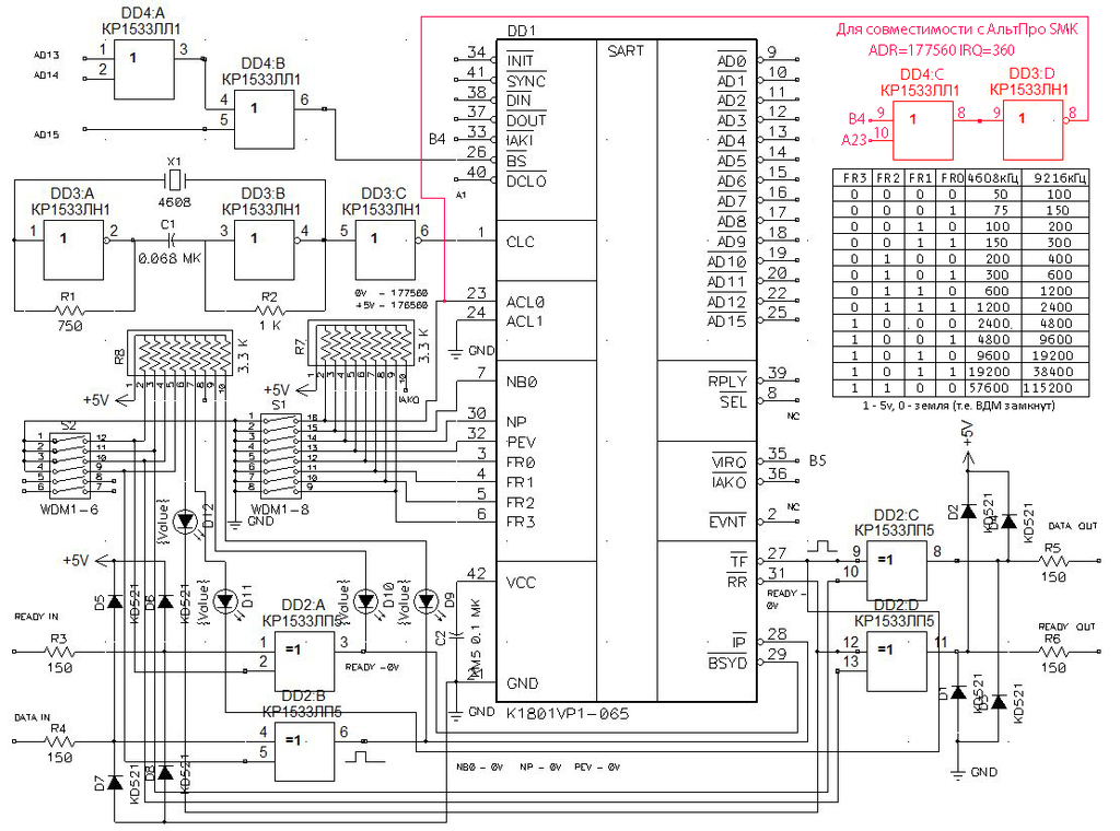 Оригинальная статья взята отсюда | За основу взята схема by MM с добавлением делителя на ТМ2 для использования кварцевого резонатора на 9216 КГц и получения скорости обмена 115200 (хотя реальная работа без проглатывания некоторых байт возможна на БК 3-4 МГц только на скорости 57600, эта скорость используется только один раз, чтобы переключить ESP8266 на 57600), стабилизатора на 3.3в для использования ESP8266 и добавлена MAX232 для реализации COM-порта. Т.к. в Altium Designer схемы не было - без косяков на плате не обошлось  |