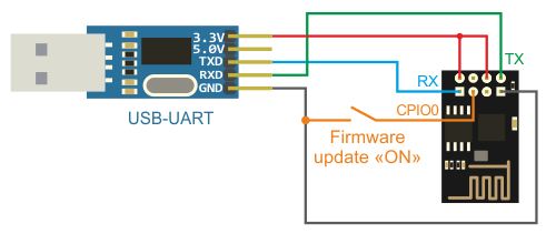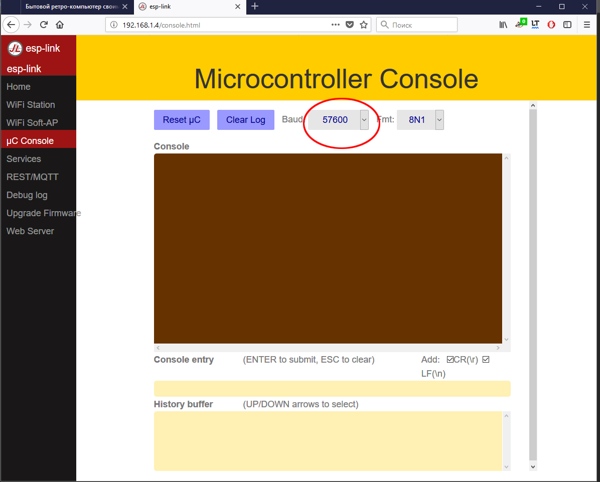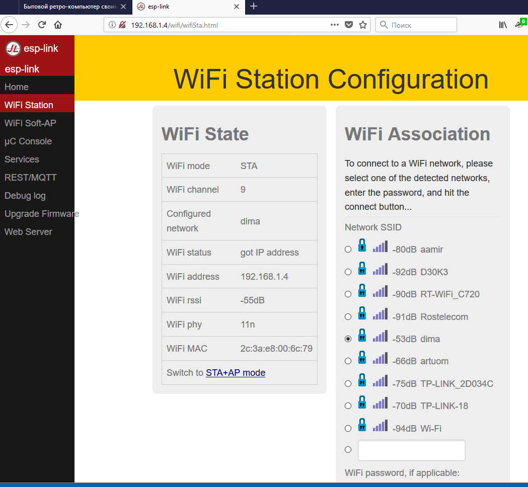Уважаемый S_V_B, не долго думая, раскопал прошивку для ESP8266-01, называется "ESP-LINK". http://samopal.pro/arduino-esp8266/Для перепрошивки на РС по UART надо только "тумблер" При подключении модуля USB-UART, надо иметь ввиду, что напряжение питания не на всех переключается. VCC, например, не значит 3.3v, надо искать. Хотя, если честно, первый раз подал 5V.. нагрелся, но без последствий Виртуальный СОМ-порт работает максимум на 57600, на 115200 не работает. Вся затея ставить 1801ВП1-065 с кварцем на 9126КГц вместо ВП1-035 терпит крах, ввиду быстродействия БК, т.к. сигналы готовности ардуиновские ESP8266 вообще не используют, а при подключении через RS232 - проблема с буферами FIFO, т.е. вообще 9600  Дальнейшая настройка - через web-интерфейс по адресу 192.168.1.4 (по умолчанию), кроме того, появляется открытая точка доступа, её надо отключить переводом в режим STAtion. В настройках виртуального COM-порта (Tibbo) надо указать скорость 57600, как и в настройках ESP.